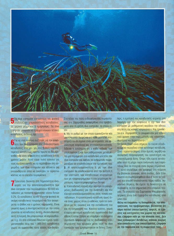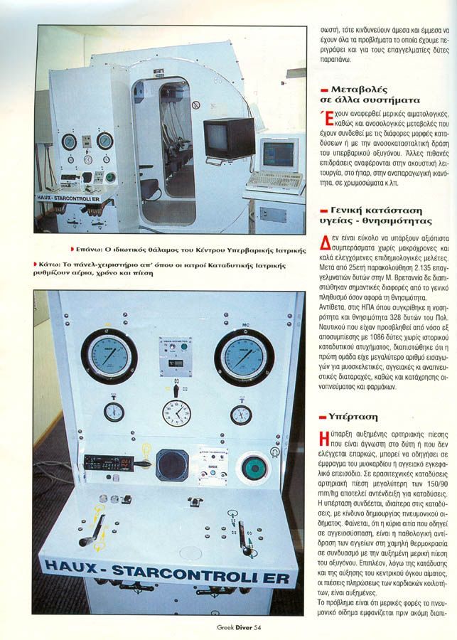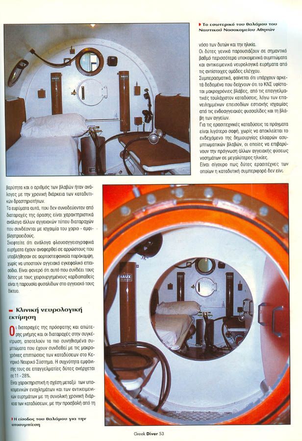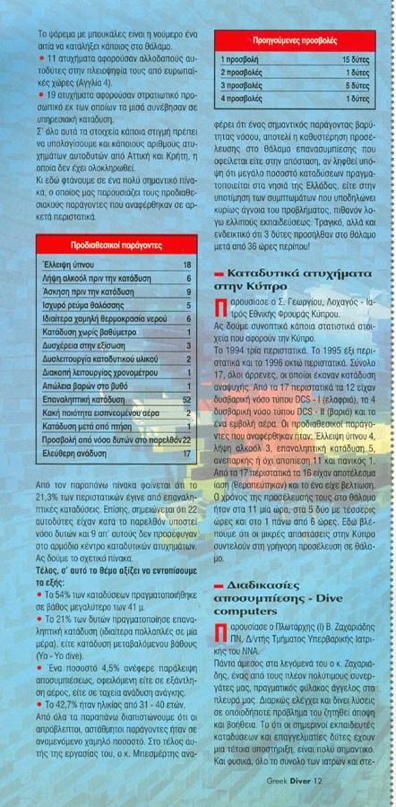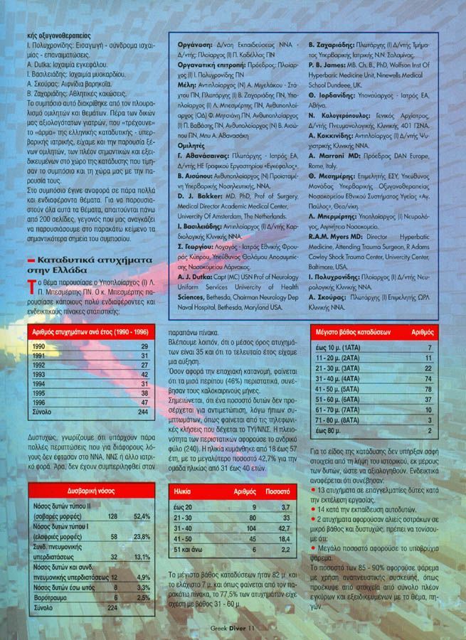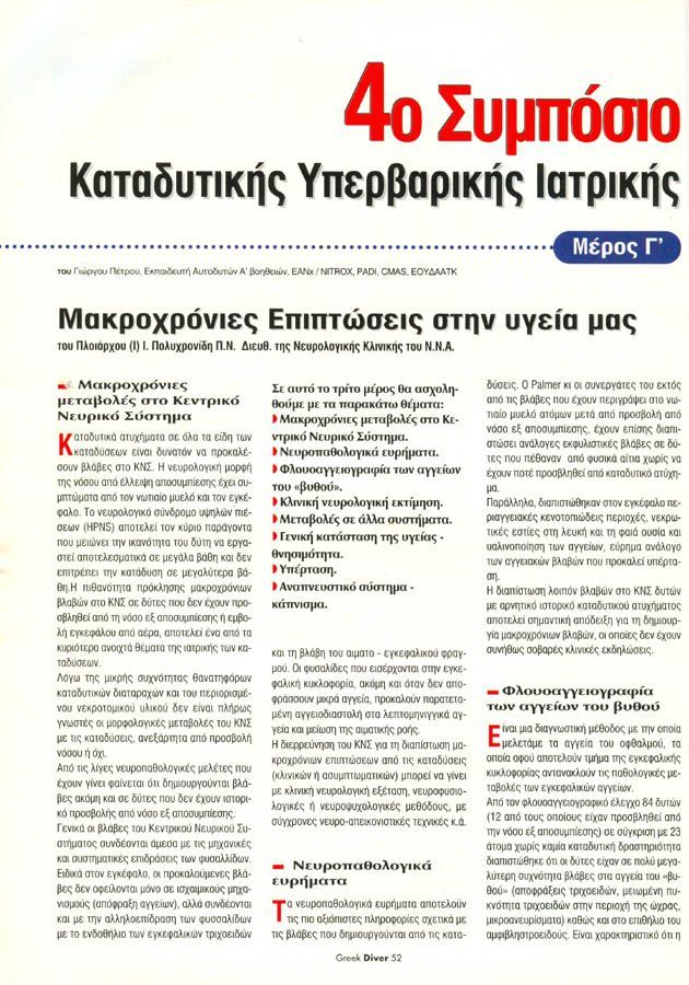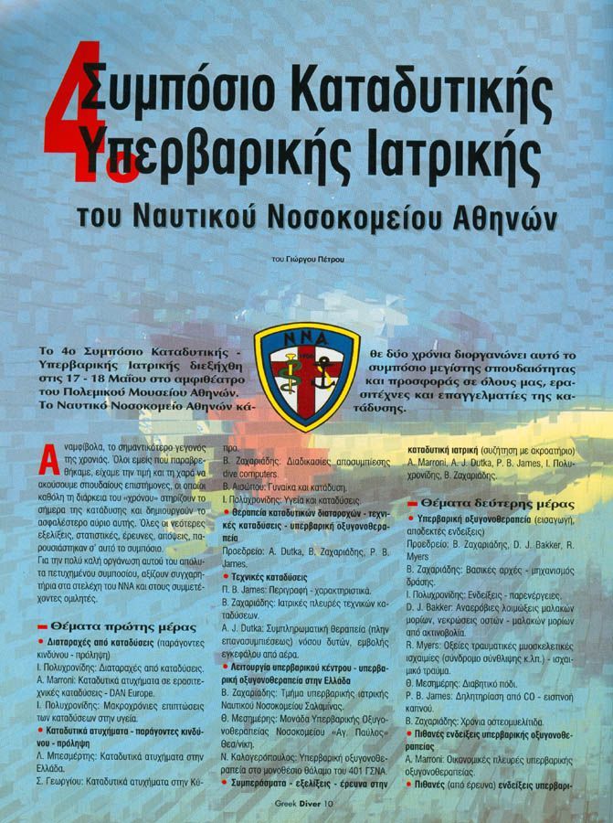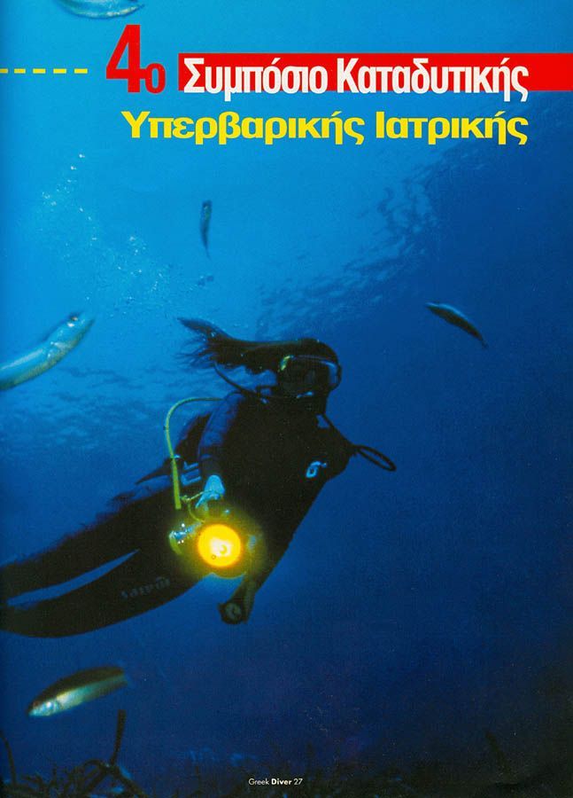 Το διήμερο 17-18 Μαίου 1997 στο Αμφιθέατρο Πολεμικού Μουσείου Αθηνών διοργανώθηκε από το Ναυτικό Νοσοκομείο Αθηνών το 4ο Συμπόσιο Καταδυτικής Υπερβαρικής Ιατρικής. Το συμπόσιο αυτό πραγματοποιείται κάθε δύο έτη. Σε αυτό ομιλητές ήσαν σημαντικότατοι επιστήμονες οι οποίοι παρουσίασαν τις νεότερες εξελίξεις, στατιστικές, εύρευνες και απόψεις. Εγώ είχα την τύχη να παραστώ και να το καλύψω δημοσιογραφικά για το Greek Diver.