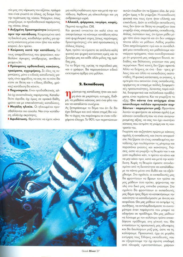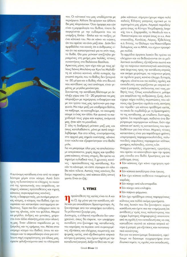 Αυτό δεν θα έπρεπε να είναι στον κατάλογό μας μιας και είναι απαραίτητη προϋπόθεση για τα ΠΑΝΤΑ στη ζωή μας. Αλλά μιας και δεν πρέπει εμείς οι λάτρεις της αυτόνομης κατάδυσης να ξεχνάμε ότι είμαστε υπό μηχανική υποστήριξη υποβρυχίως η υγεία τόσο σωματική όσο και ψυχική οφείλουμε να είναι ιδανική για να πραγματοποιήσουμε μια κατάδυση, Ιδιαίτερα στην περίπτωση της τεχνικής κατάδυσης σε επίπεδα decopression , cave diving, Trimix & Rebreather η σωματική και ψυχική κατάστασή μας οφείλουμε να είναι εξαιρετική.