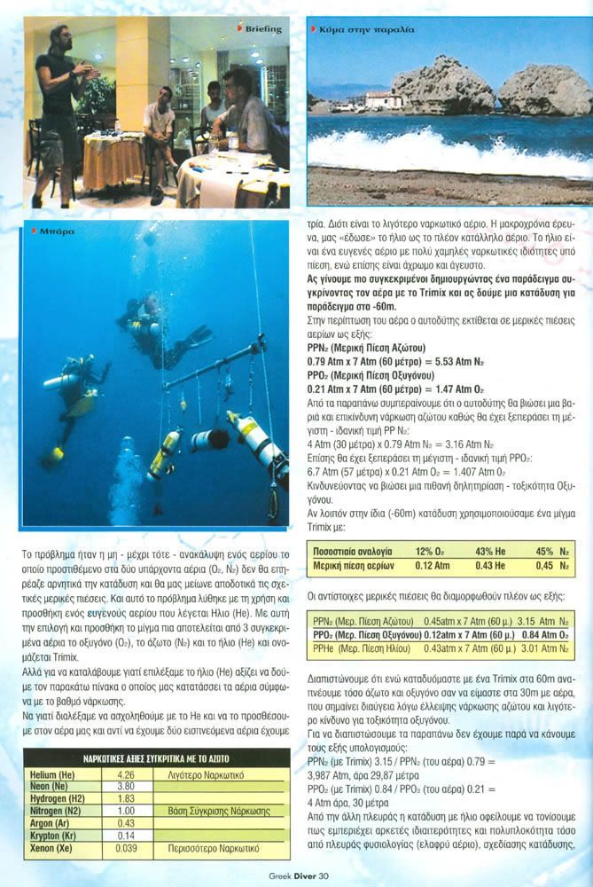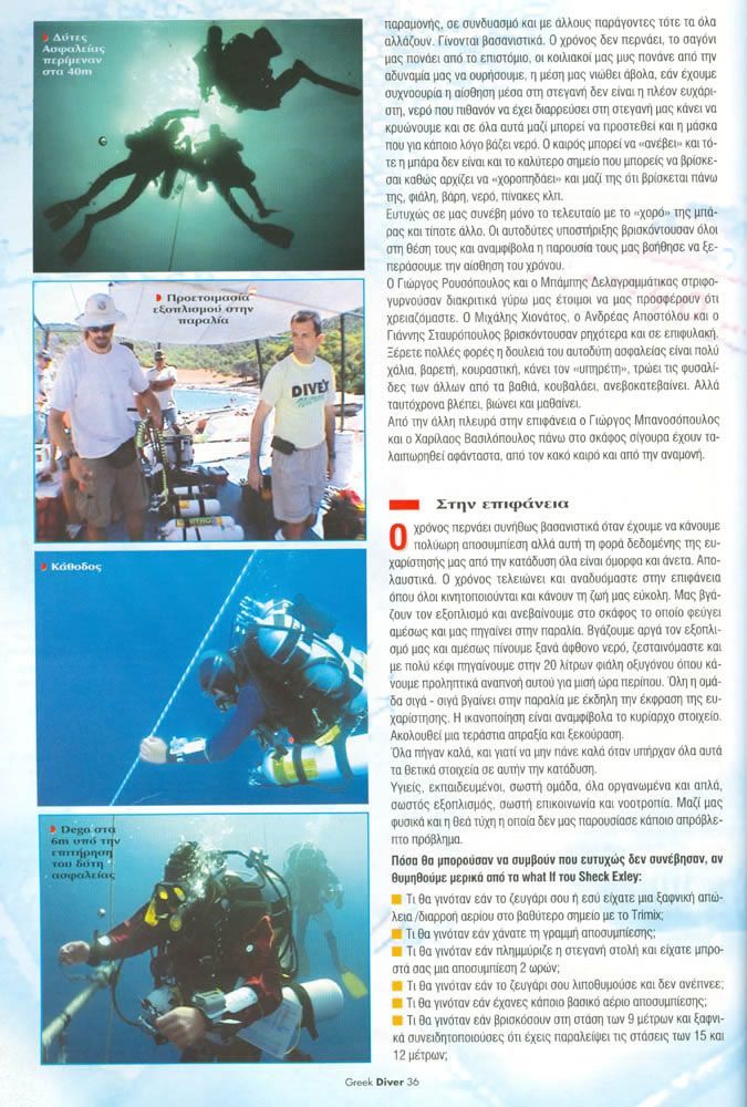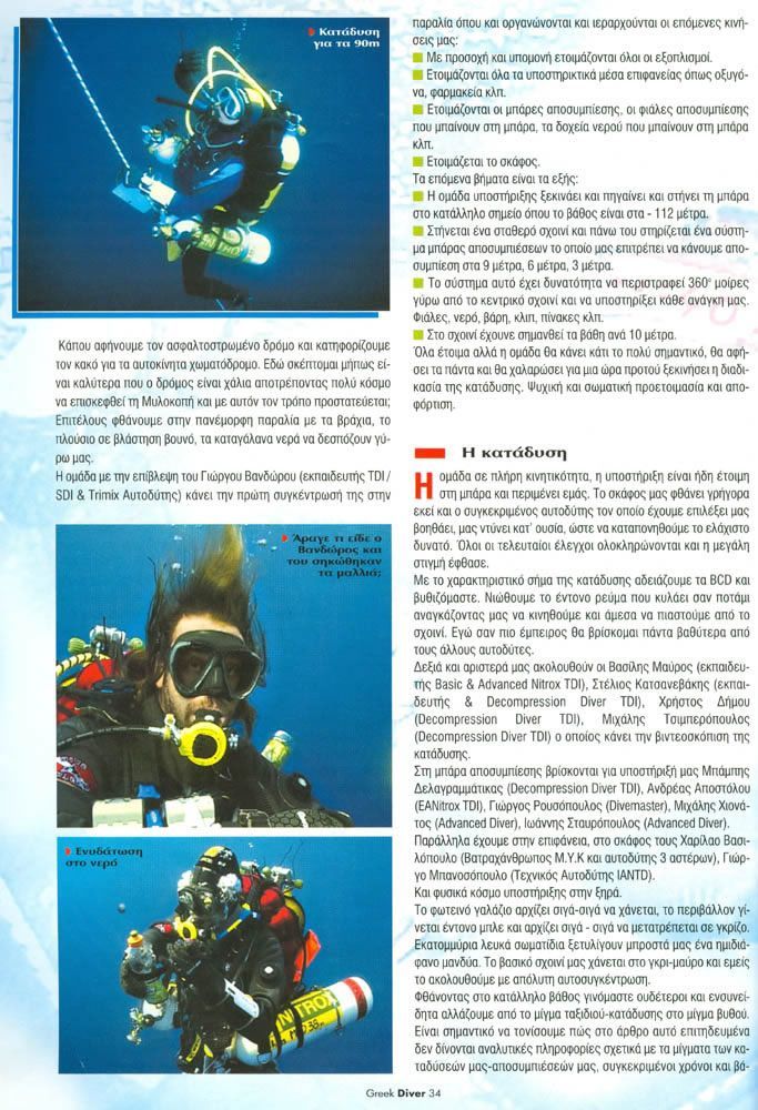 διοργάνωσαν στα μέσα Αυγούστου σχολείο μικτών αερίων με συμμετοχή συνολικά 12 ατόμων (2 εκπαιδευόμενοι και 10 αυτοδύτες ασφαλείας και υποστήριξης επιφανείας). Το σχολείο πραγματοποιήθηκε σύμφωνα με τα standards και τις διαδικασίες της TDI με μέγιστο βάθος τα -90m, ενώ είχε την ιδιαιτερότητα να επεκτείνει τα πεδία της εκπαίδευσης στην σωστή οργάνωση, συντονισμό και δράση μιας μεγάλης ομάδας υποστήριξης.