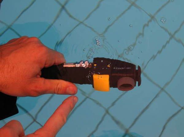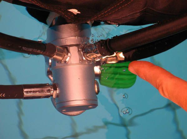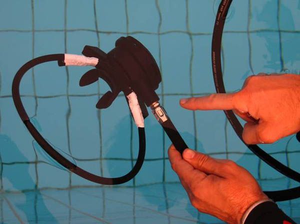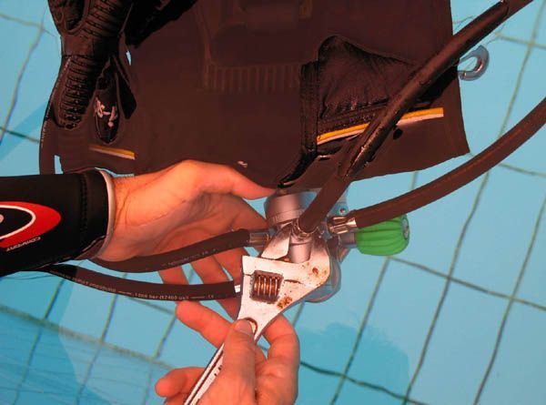 Εν συνεχεία βυθίζουμε τον εξοπλισμό μας με ανοιχτή την πίεση και παρατηρούμε εάν έχουμε φυσαλίδες να βγαίνουν από κάποιο σημείο. Ένα πιθανό σημείο είναι το σημείο που ενώνονται οι σωλήνες χαμηλής πίεσης με το Α΄ στάδιο του ρυθμιστή πίεσης.