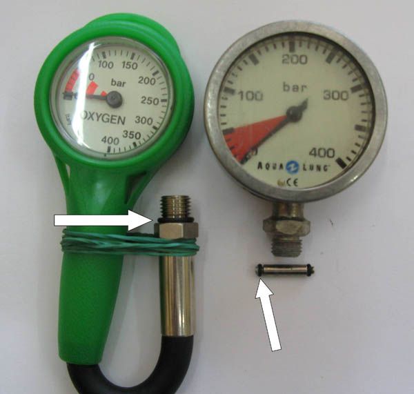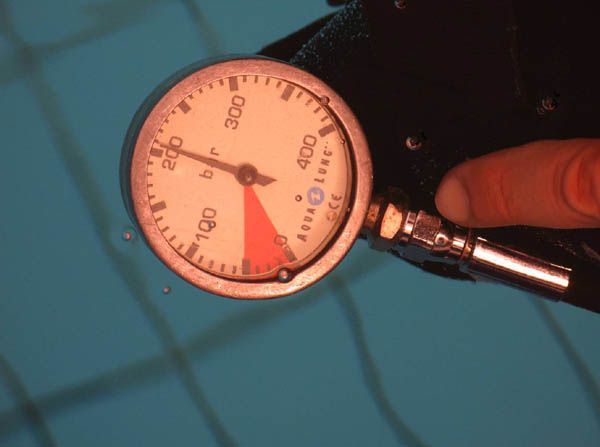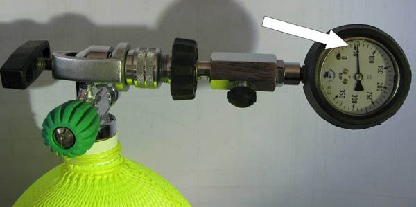 Τοποθετούμε το μανόμετρο ελέγχου πίεσης και σιγουρευόμαστε για το εάν έχουμε επάρκεια αερίου και τι πίεση έχουμε. Πάρα πολλές φορές κάποιος νοικιάζει μια φιάλη, ή παίρνει λάθος φιάλη (την φιάλη με την οποία καταδύθηκε την προηγούμενη ημέρα) και φθάνει στην θάλασσα να διαπιστώσει τελευταία στιγμή ότι δεν έχει επάρκεια αερίου καθώς το μανόμετρο δείχνει χαμηλή πίεση. Αποτέλεσμα να χάσει την κατάδυσή του.