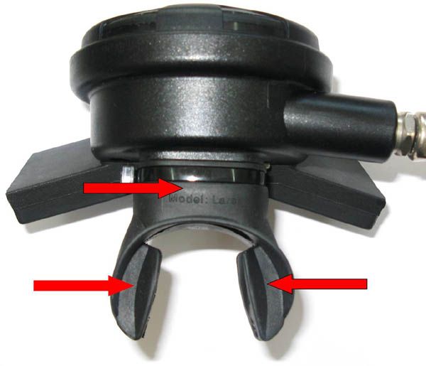 Ελέγχουμε το επιστόμιο του 2ου σταδίου του ρυθμιστή μας. Τα δύο βασικά σημεία είναι το σημείο που εφάπτονται, δαγκώνουν τα δόντια μας και το σημείο που το επιστόμιο ακουμπάει στο πλαστικό (ή μεταλλικό εάν πρόκειται για μεταλλικό Β΄ στάδιο) του ρυθμιστή πίεσης. Είναι το σημείο που ευρίσκεται και ο πλαστικός σφικτήρας.