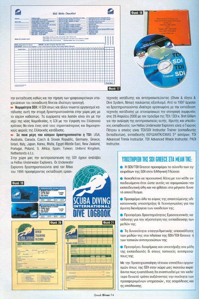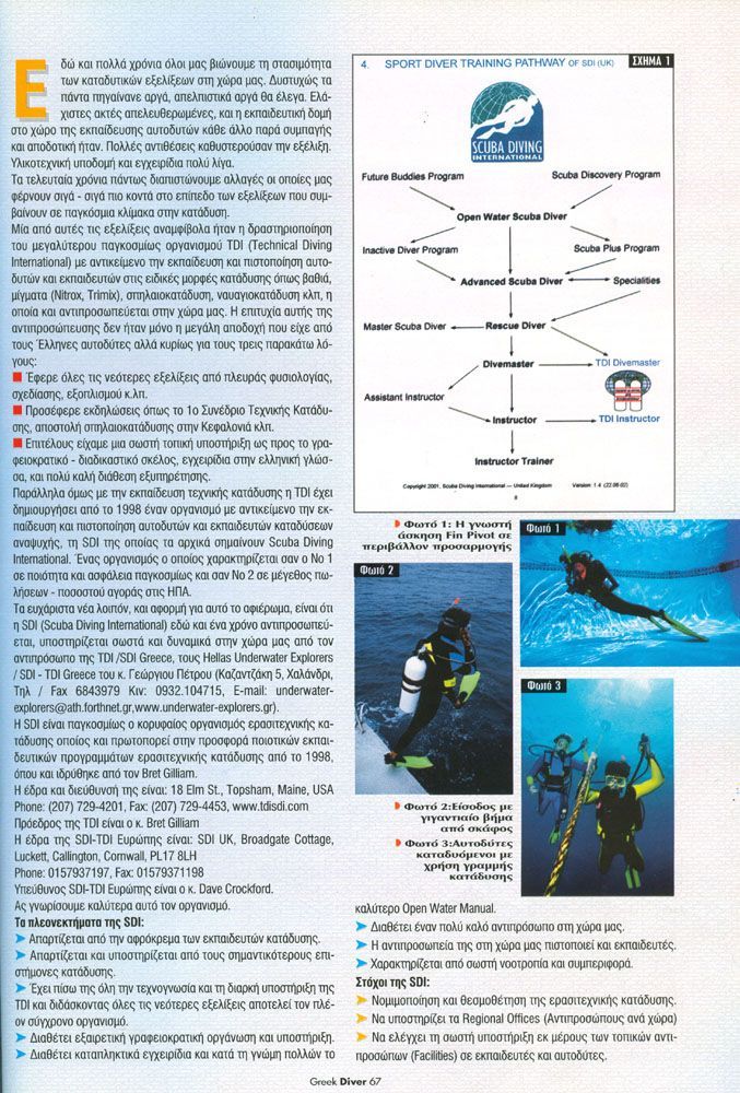Η δραστηριοποίηση κάθε νέου οργανισμού στη χώρα μας αποτελούσε πάντα ένα παράγοντα ανάπτυξης. Έτσι με την έλευση της SDI (Scuba Diving International) η κατάδυση έκανε βήματα μπροστά μιας και ο γνωστός Αμερικάνικος οργανισμός (το ερασιτεχνικό παρακλάδι της TDI – Technical Diving International) αντιπροσωπευόμενος από τους HUE εισήγαγε μέσα στη Ελληνική καταδυτική αγορά μας νέα μεθοδολογία, τεχνογνωσία και εξαιρετική υλικοτεχνική υποδομή. Το άρθρο αυτό μας παρουσιάζει βασικά στοιχεία του οργανισμού. (Ο οργανισμός σήμερα δεν αντιπροσωπεύεται από τους HUE).