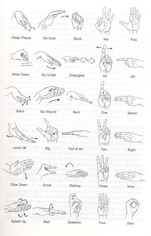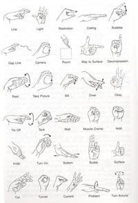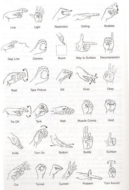 Η επικοινωνία στην ανοιχτή θάλασσα έχει τις δυσκολίες της κάποιες φορές, στην νυχτερινή κατάδυση τα πράγματα γίνονται δυσκολότερα. Στα σπήλαια όπου έχουμε πολύ περισσότερα σε αριθμό σήματα απαιτείται ορθότητα επιλογής και ξεκάθαρο σήμα. Ας δούμε παρακάτω αρκετά από τα σήματα τα οποία χρησιμοποιούνται στην Σπηλαιοκατάδυση αρχίζοντας από πάνω αριστερά και πηγαίνοντας προς δεξιά και εν συνεχεία στην επόμενη από κάτω σειρά και ούτω κάθε εξής: