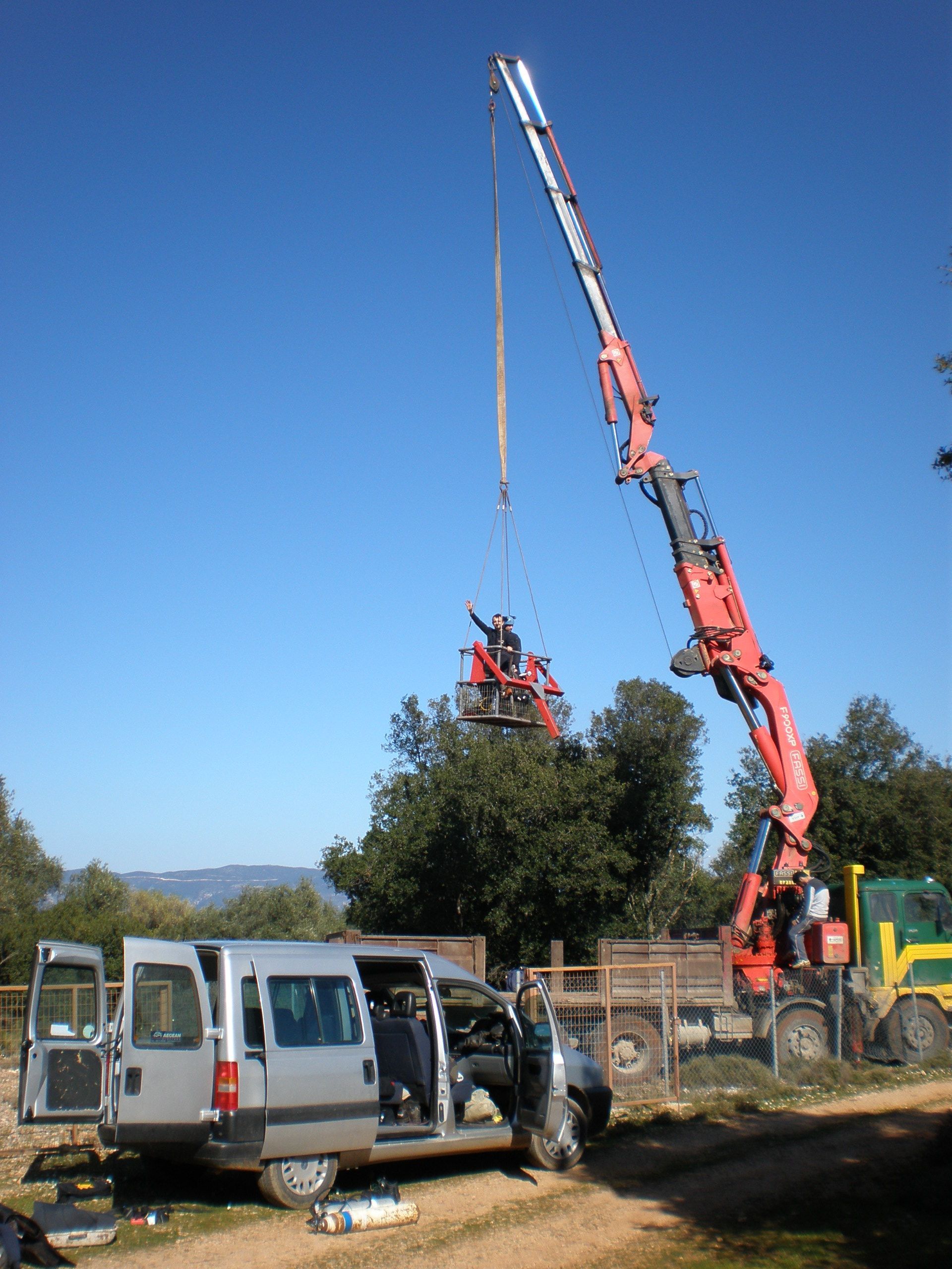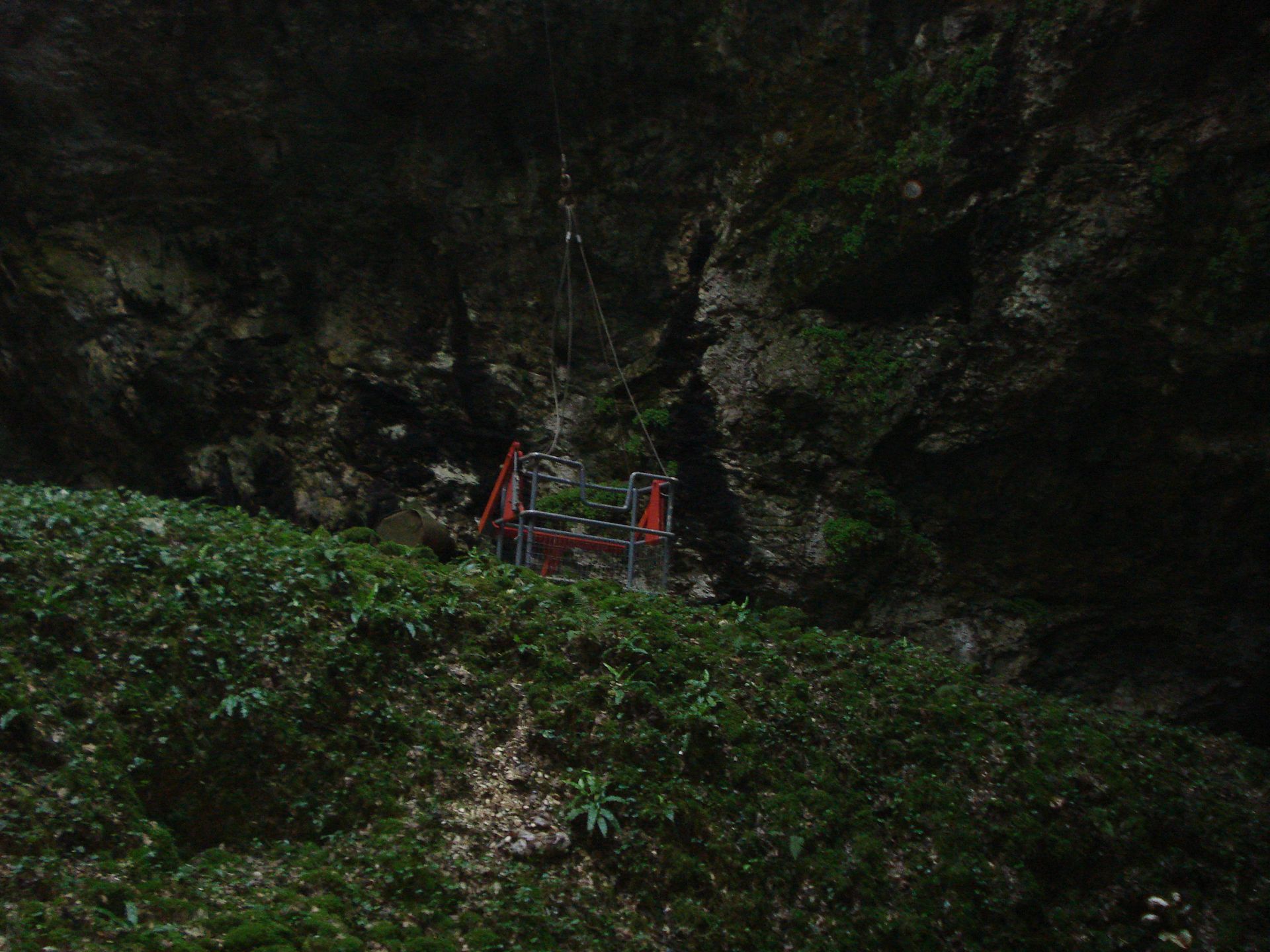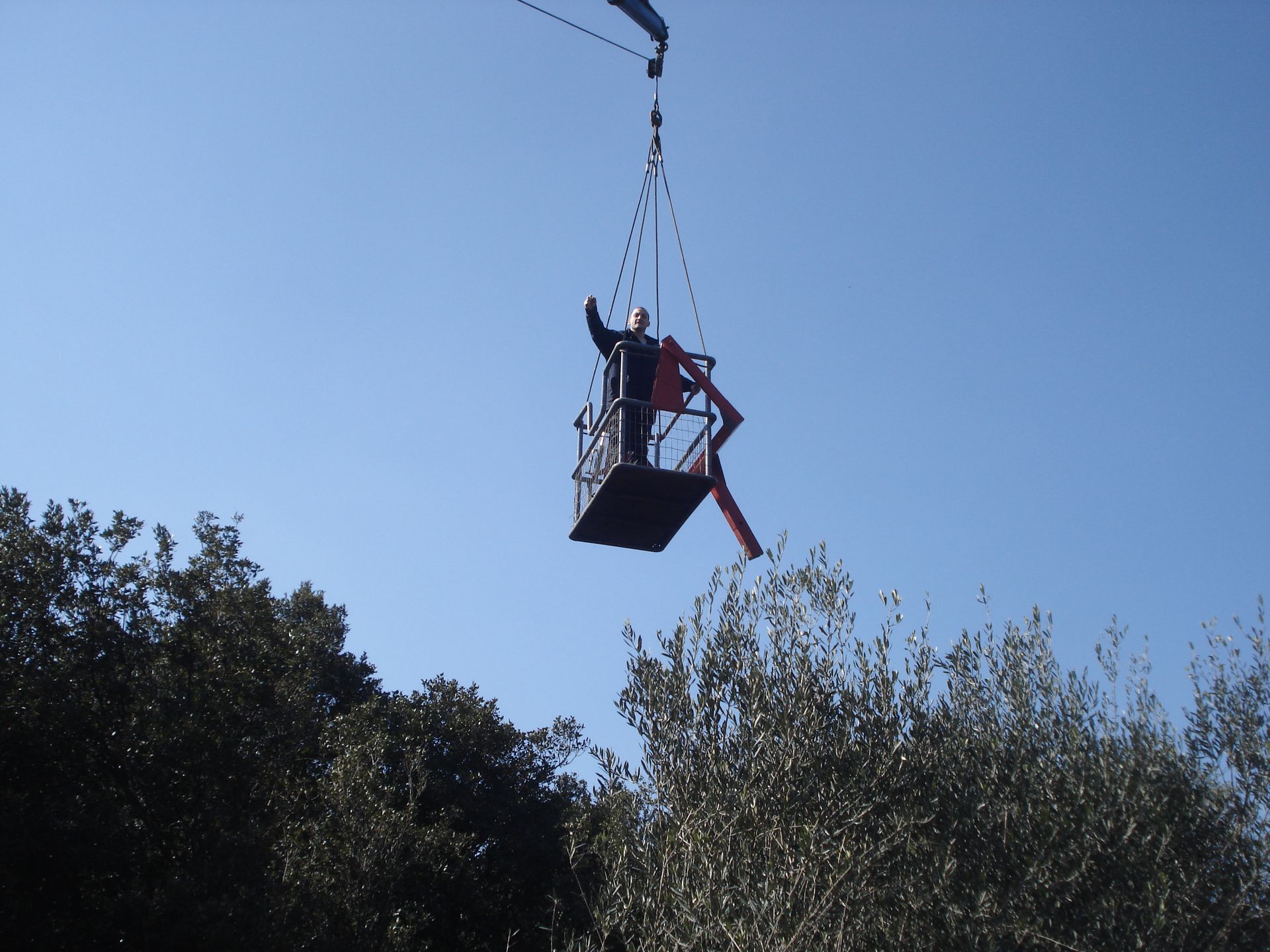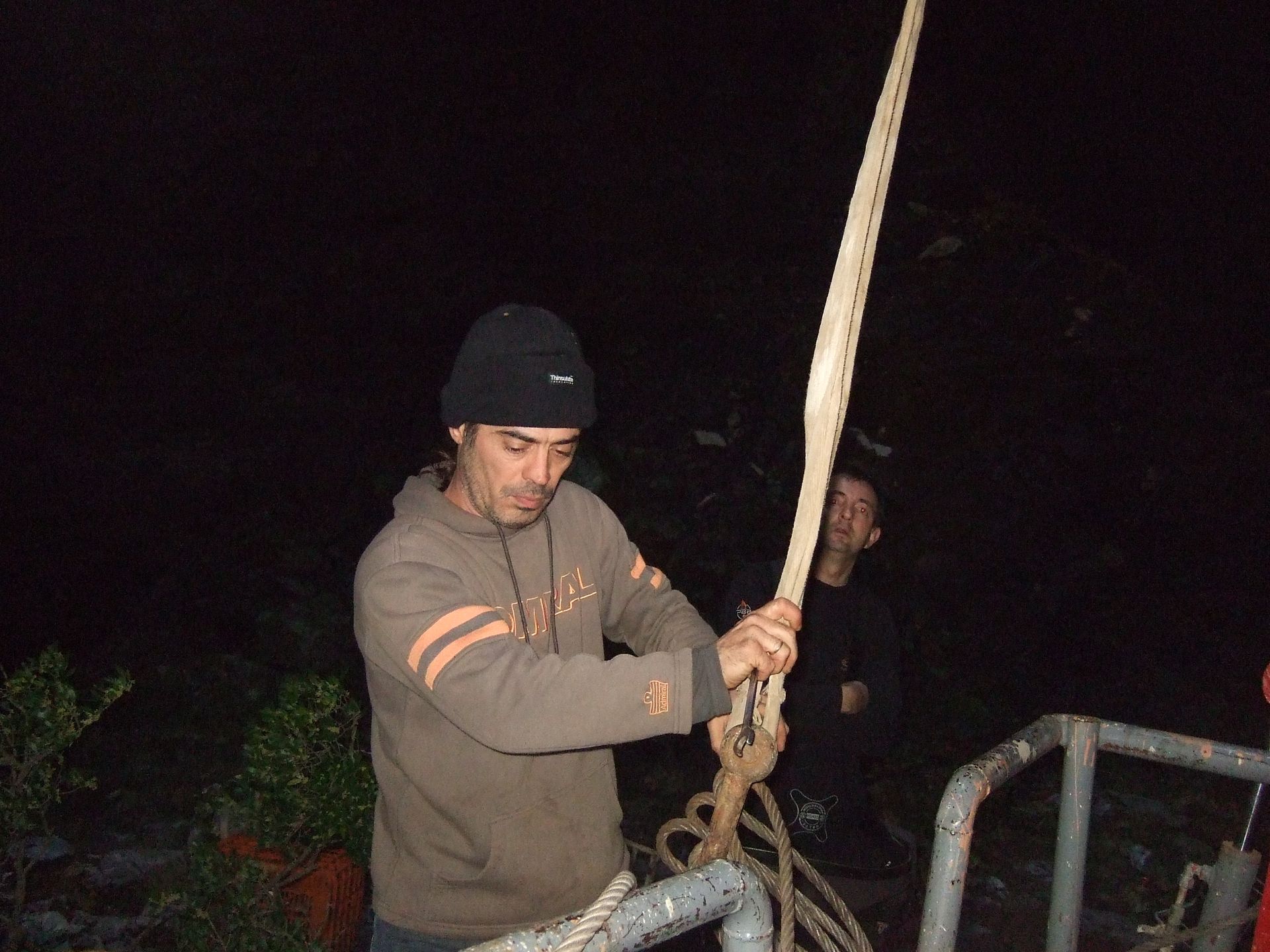 The roles had been clarified and Elias and Tasos would be responsible for supporting the two cavers who would do the exploration. That is, all the hard, thankless work, but you can't imagine how important it was. There was no way, as it turned out, that we could have done it without them as they demonstrated responsibility, professionalism, endurance and patience. For the descent to the bottom of the abyss, we enlisted a crane that lowered us with its basket to the top of a hill that was clearly the material of the roof - ground before the precipitation was made. To get down, we had to cut branches with dense foliage with a saw. Then, with ropes and the crane basket, we lowered our equipment. Any mistake could have been disastrous to fatal.