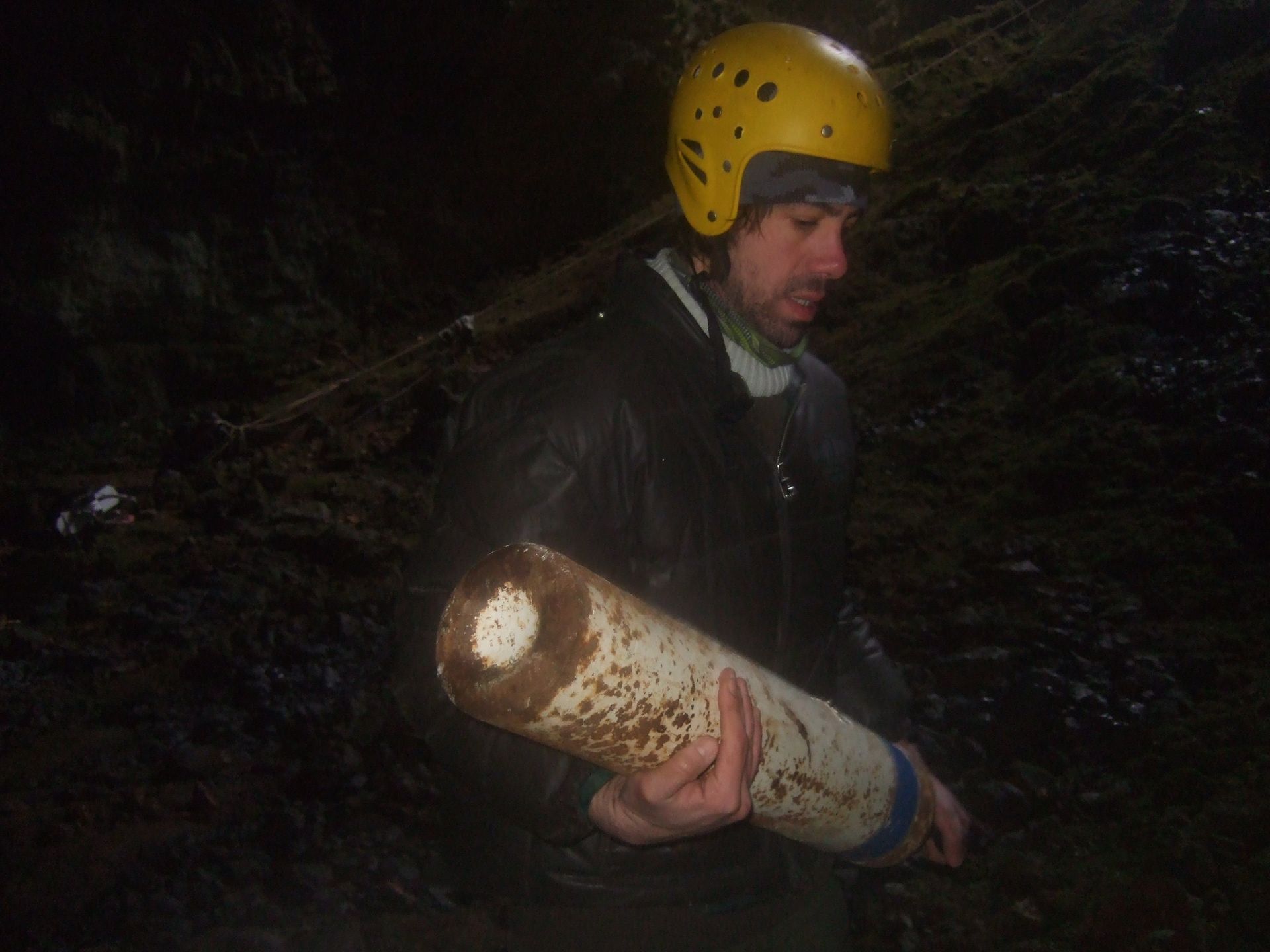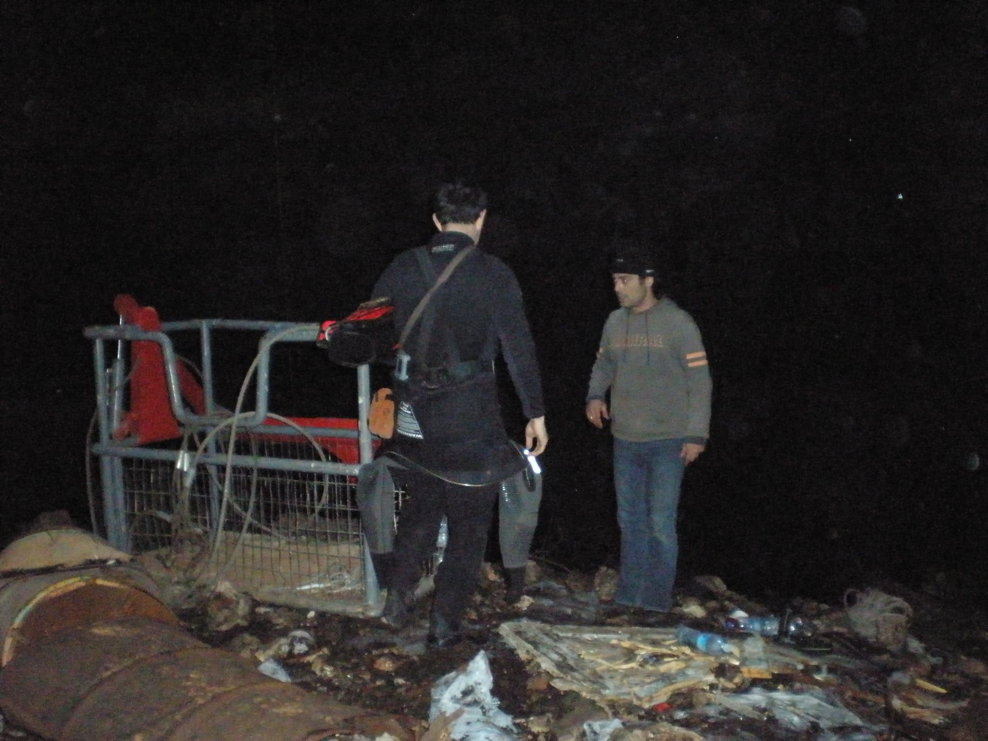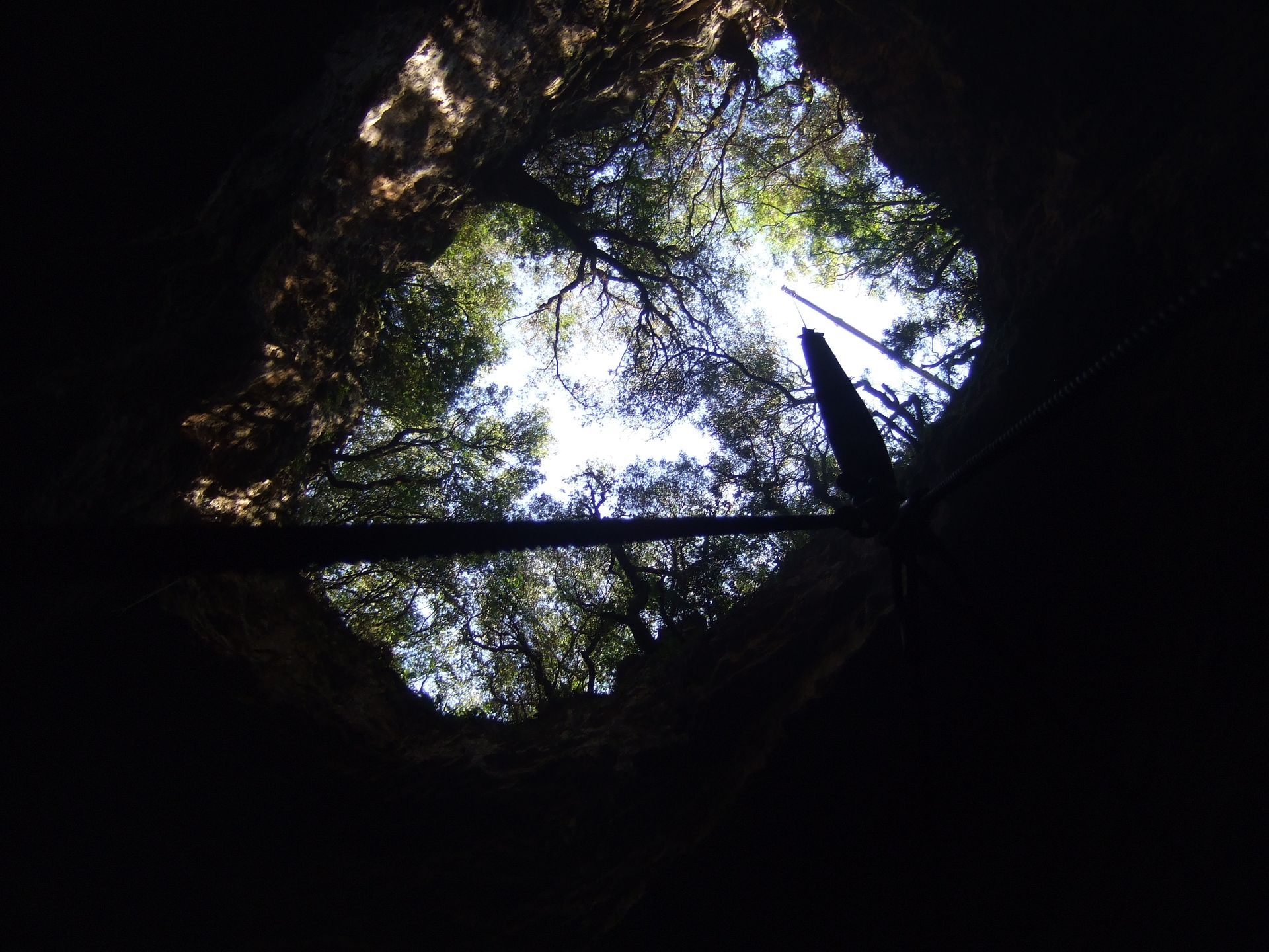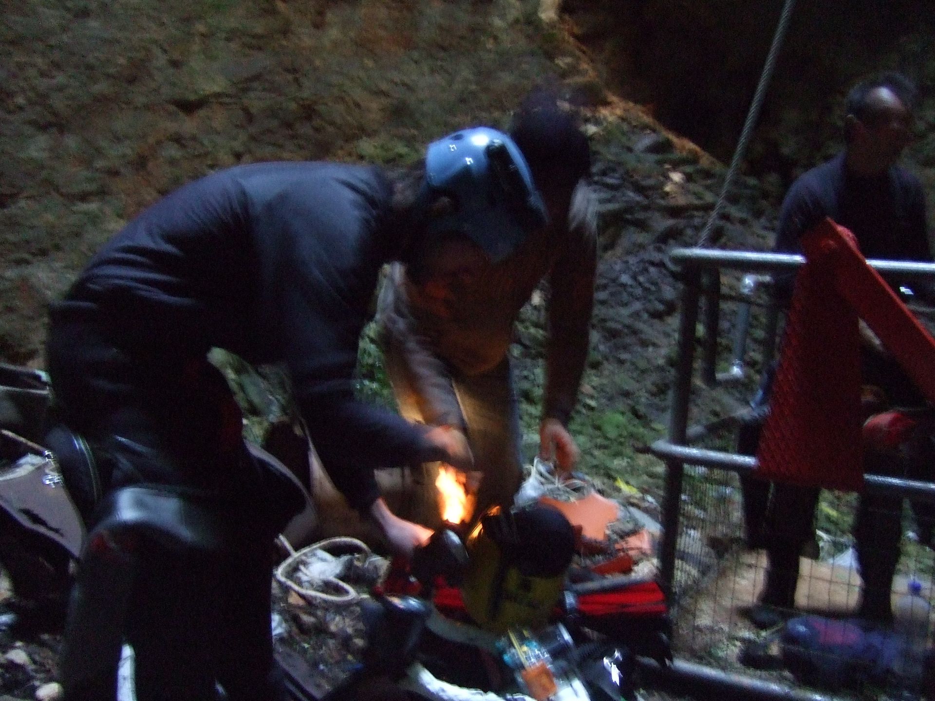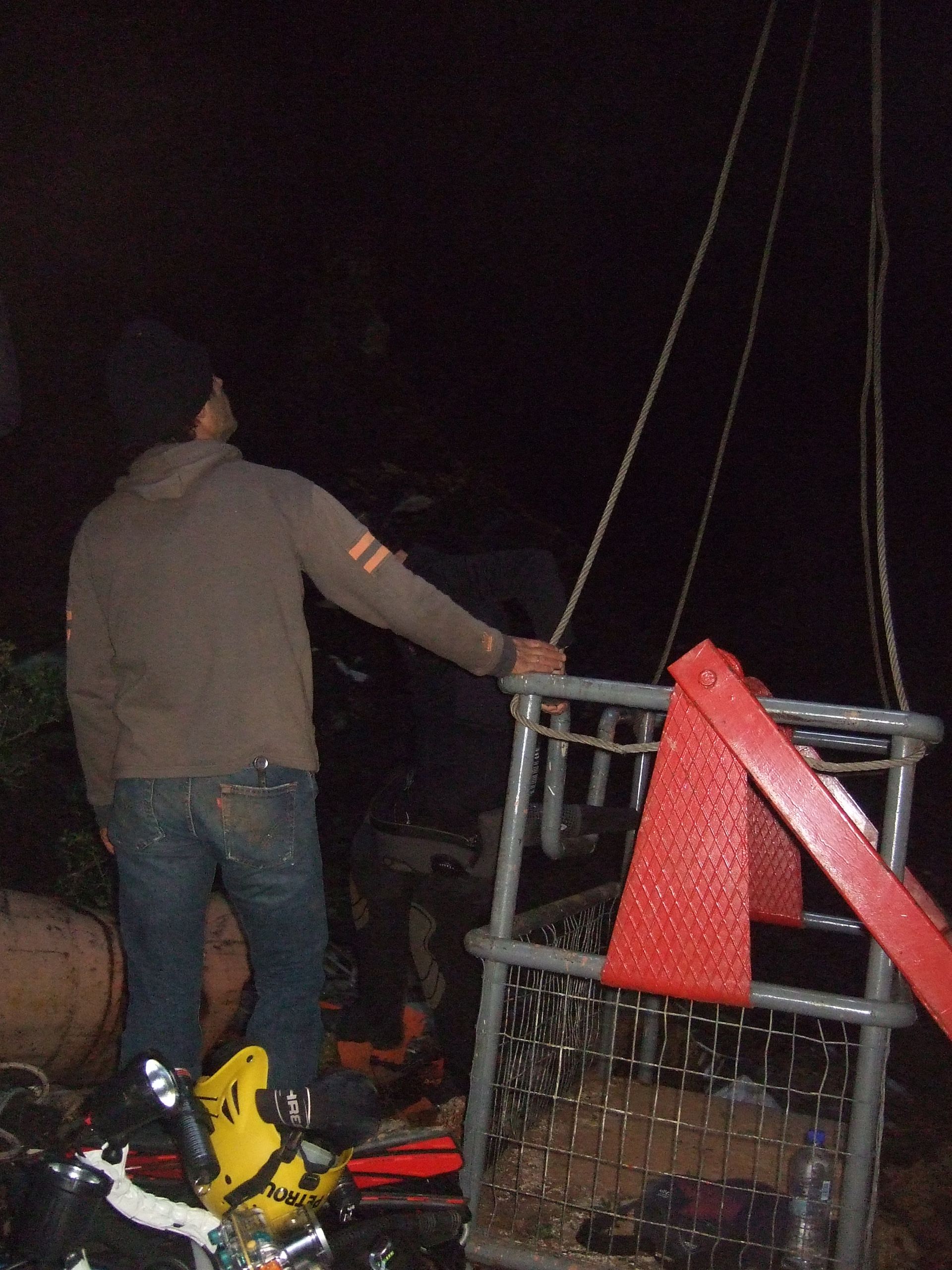 The roles had been clarified and Elias and Tasos would be responsible for supporting the two cavers who would do the exploration. That is, all the hard, thankless work, but you can't imagine how important it was. There was no way, as it turned out, that we could have done it without them as they demonstrated responsibility, professionalism, endurance and patience. For the descent to the bottom of the abyss, we enlisted a crane that lowered us with its basket to the top of a hill that was clearly the material of the roof - ground before the precipitation was made. To get down, we had to cut branches with dense foliage with a saw. Then, with ropes and the crane basket, we lowered our equipment. Any mistake could have been disastrous to fatal.