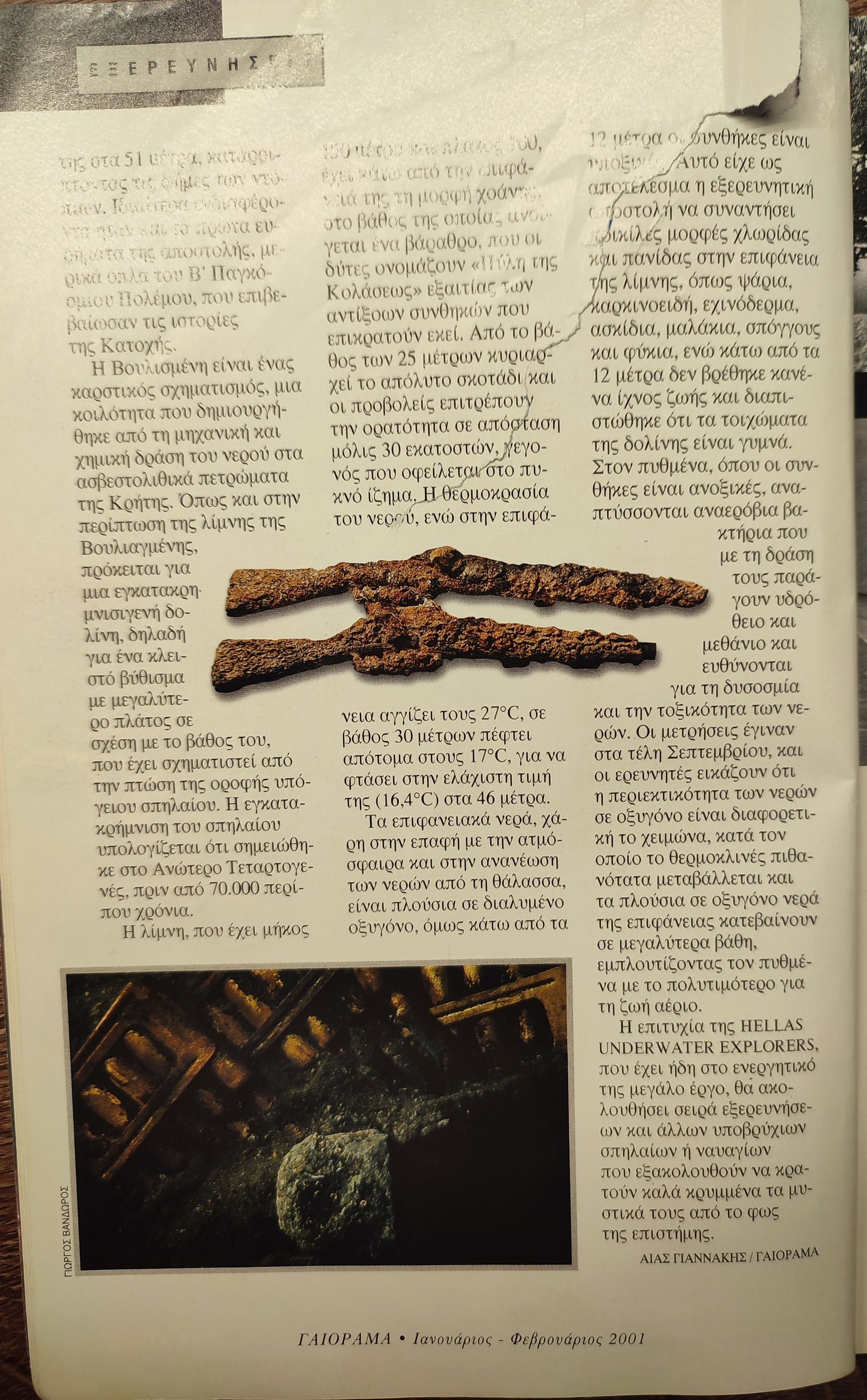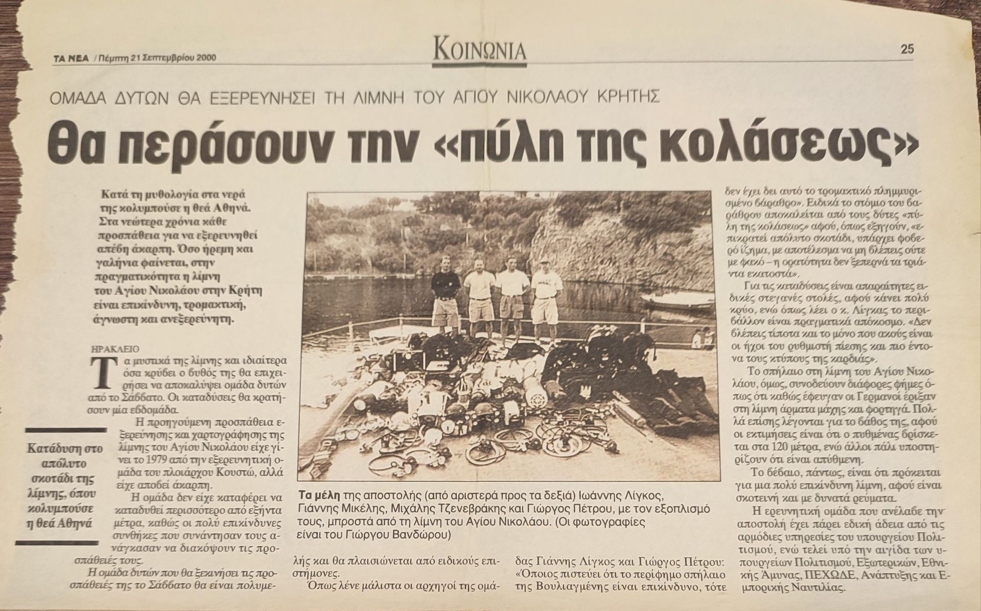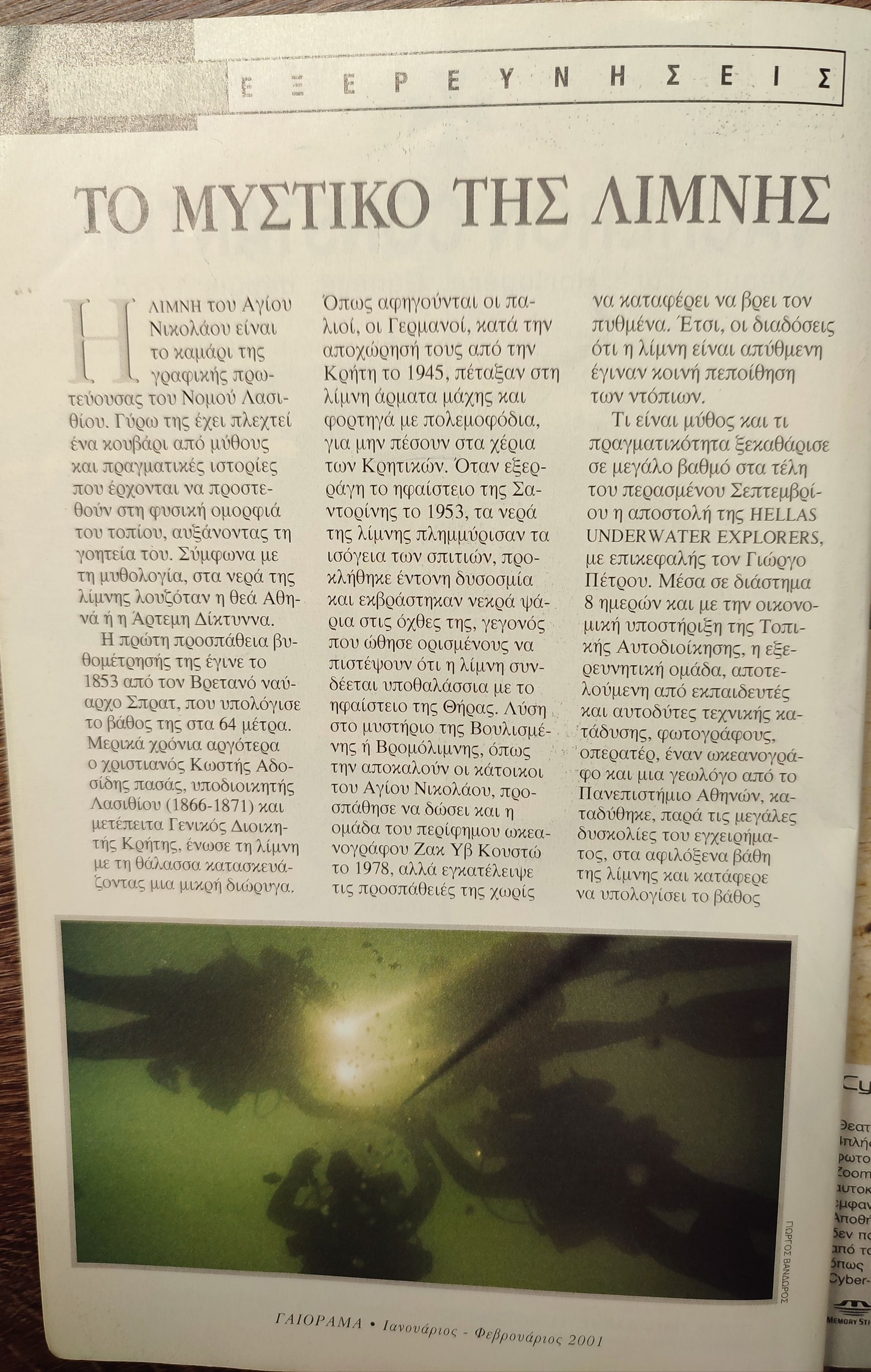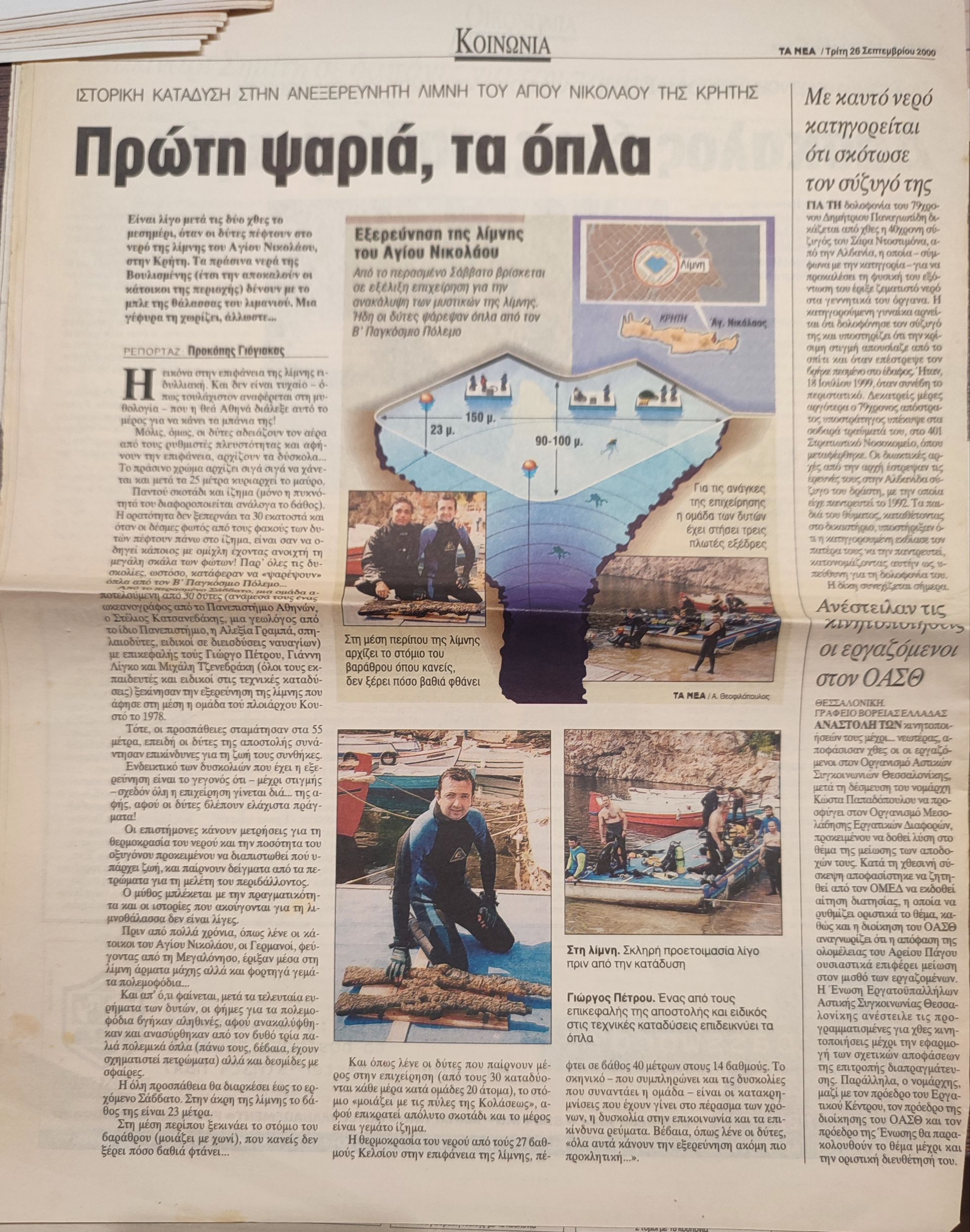 The diving begins with the whole world of Crete watching with great interest. The local authorities supported the project to the fullest extent possible. The interest of the media nationwide is enormous. Lost deep in time, these myths wanted the Abyss of the Lagoon of Agios Nikolaos to be an Abyss, a Lie, a bottomless lake around which countless stories were woven. In 1945, the conquerors, while fleeing, threw all their light and heavy weapons into it so that it would not fall into the hands of the Cretans. Weapons, tanks, radar!!! All the elders confirm the fact but no one believes them.