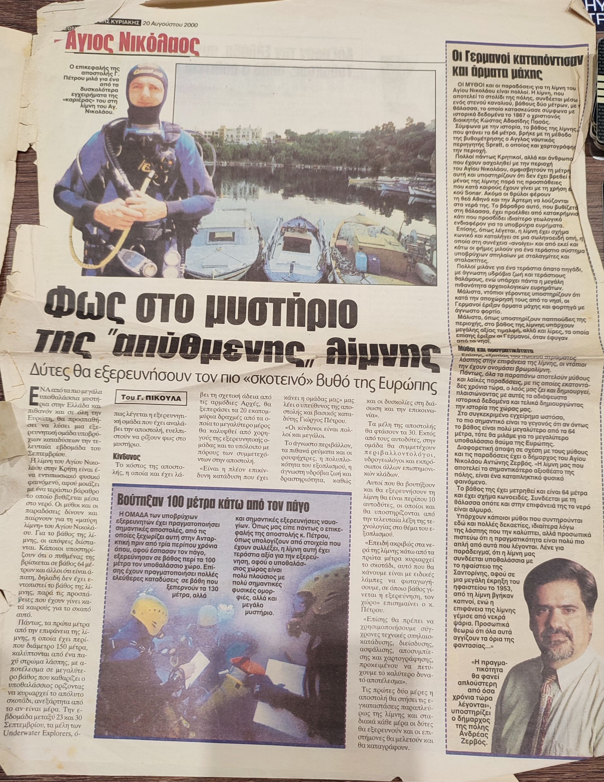 The period from 22 to 30 September 2000 will be an important period for the history of the lagoon. A Greek Expedition will carry out a series of dives with the aim of Exploring & Mapping the lake. HELLAS UNDERWATER EXPLORERS is one of the most specialized exploration groups with extensive experience in special forms of diving. The preparation began in 1998 as the expedition leader George Petrou informs us.