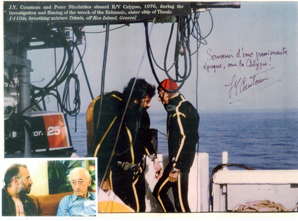 Το 1975, μετά από πρόσκληση της Ελληνικής κυβέρνησης άρχισε εξερευνήσεις στο Αιγαίο. Εξερεύνησε διάφορες περιοχές, κυρίως ανάμεσα στη Σαντορίνη και την Κρήτη και απέκλεισε την ύπαρξη της χαμένης Ατλαντίδας στη συγκεκριμένη περιοχή[21]. Επίσης εξερεύνησε το αρχαίο ναυάγιο, η αρχική ανακάλυψη του οποίου έφερε στο φως τον μηχανισμό των Αντικυθήρων, ενώ ανακάλυψε και το κουφάρι του βυθισμένου πλοίου Britanic(Βρετανικός).