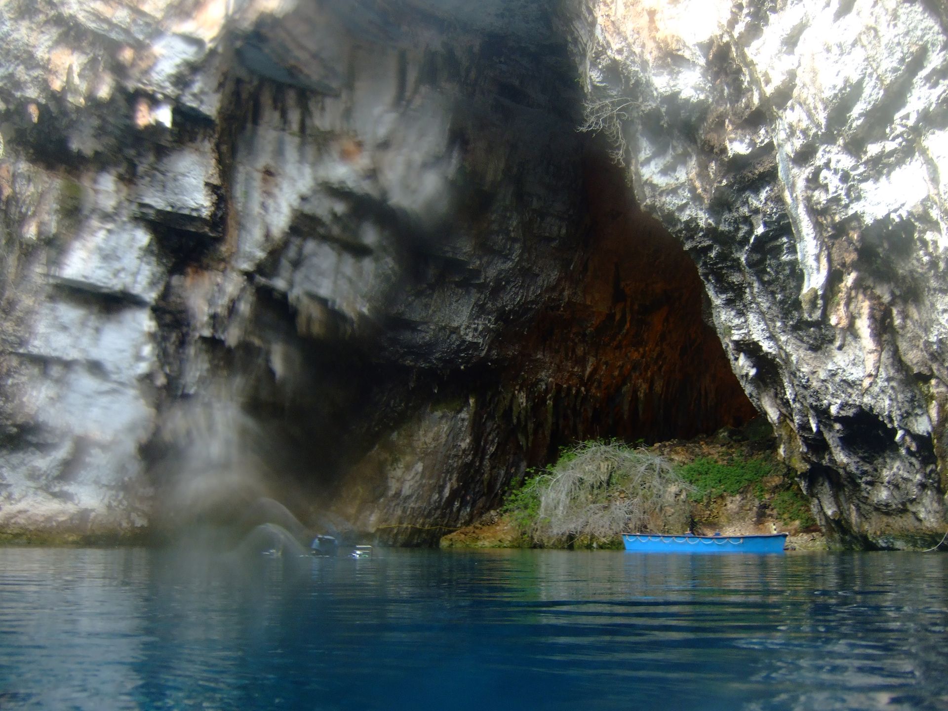 Melissani was discovered in 1951 by the speleologist Petrochilos and since then it has developed very much in terms of tourism, attracting a large number of visitors. The sight of the lake becomes unique when the sun reaches a vertical position from above and its rays create an incomparable turquoise permeability in it. In ancient times, the lake was a place of worship of Pan and the nymph Melissanthe. Legend has it that Melissanthe committed suicide in the lake out of her sadness, because Pan did not respond to her love. According to another version, the shepherdess Melissanthe lost a sheep and while trying to find it, she stumbled and fell into the lake. Inside the lake is an island, on which the archaeologist S. Marinatos discovered a sanctuary of Pan, the findings of which are in the Archaeological Museum of Argostoli. These findings are a clay figurine of the god Pan, a clay disk depicting dancing nymphs, a clay slab with a procession of nymphs and a small tile with a relief female figure. Water penetrates the limestone rocks, erodes them and creates cavities through a process called karstification. In 1963, it was found that the lake cave communicates with the entire karst network of the island and was even confirmed after testing with colored water poured into the sinkholes in Argostoli, at the other end of the island. Stalactites and stalagmites, thousands of years old, with strange shapes, decorate the largest part of the underwater cave in which visibility is excellent up to 30 meters (you really feel like you are floating in the void) if the bottom is not disturbed by clumsy movements. A bottom where we can see huge boulders resting, parts of the roof, which have obviously been detached due to an earthquake. The water is almost sweet because the passage of the sea through the limestone subsoil mixes with the rainwater and that is where the constant low temperature is due, at 14-15 degrees Celsius all year round. Diving into the center of the lake, you come across a hill which is essentially the roof that has fallen and there you meet small eels and mullets. Also in its mud you find bullets and shells from the 1940 war.