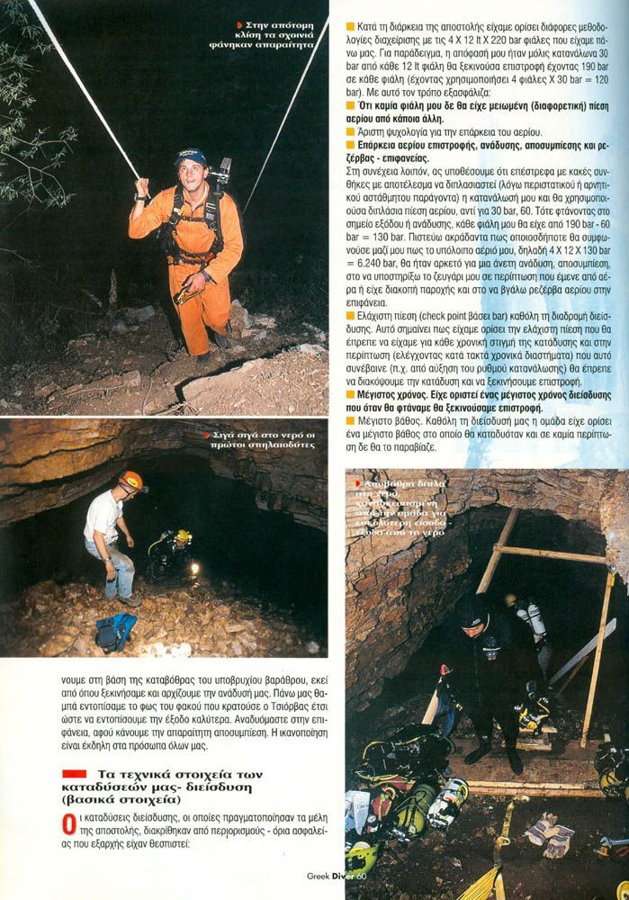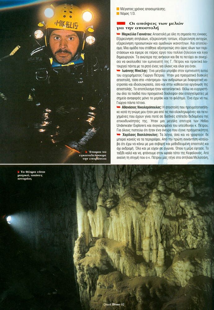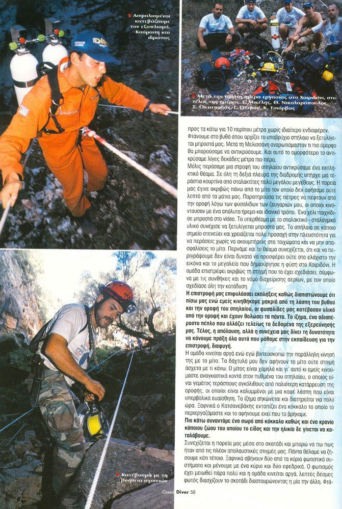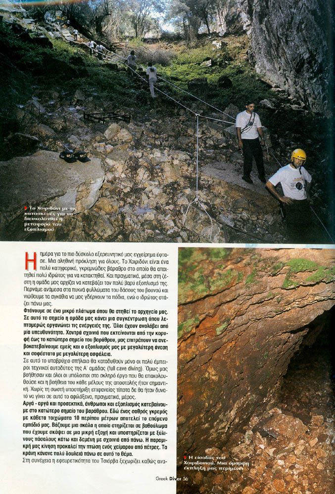 Chiridoni is a cave diving challenge along with the cave caves of Agia Eleousa and Agia Theodorou. In 2001, such an expedition was an extreme situation that seemed very difficult. A previous exploration there had been carried out by the team of Vasilis Giannopoulos with Jean-Jacques Bolanz, Louigi Casati and Patrick Deriaz. The large team of Hellas Underwater Explorers organized the support extremely well and the few cave divers led by Giorgos Petrou made some of the most beautiful dives of their lives in an incredibly magical world.