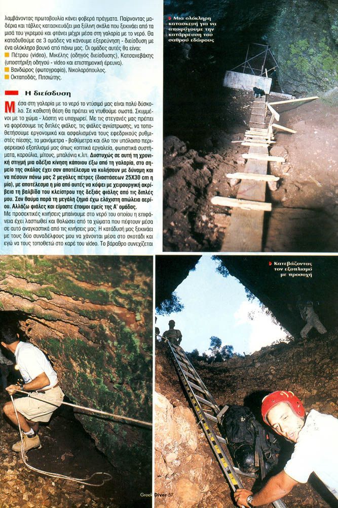 Η παραμικρή μας κίνηση προκαλεί την πτώση ενός χειμάρρου από πέτρες. Τα κράνη κάνανε πολύ δουλειά πάνω σε αυτό το θέμα. Εν συνεχεία η εφευρετικότητα του Κώστα Τσιόρβα ξεχωρίζει καθώς αναλαμβάνοντας πρωτοβουλία κάνει φοβερά πράγματα. Παίρνοντας μαδέρια & τάβλες κατασκευάζει μια ξύλινη σκάλα που ξεκινάει από τα μισά του γκρεμού και φτάνει μέχρι μέσα στην γαλαρία με το νερό!!! Τοποθετούμε και μεταλλικές σίτες για να προστατευθούμε από τις πέτρες που ακατάπαυστα πέφτουν από τα σαθρά τοιχώματα του βουνού. Οι σίτες αυτές ακόμη και σήμερα κάνουν την δουλειά τους.....