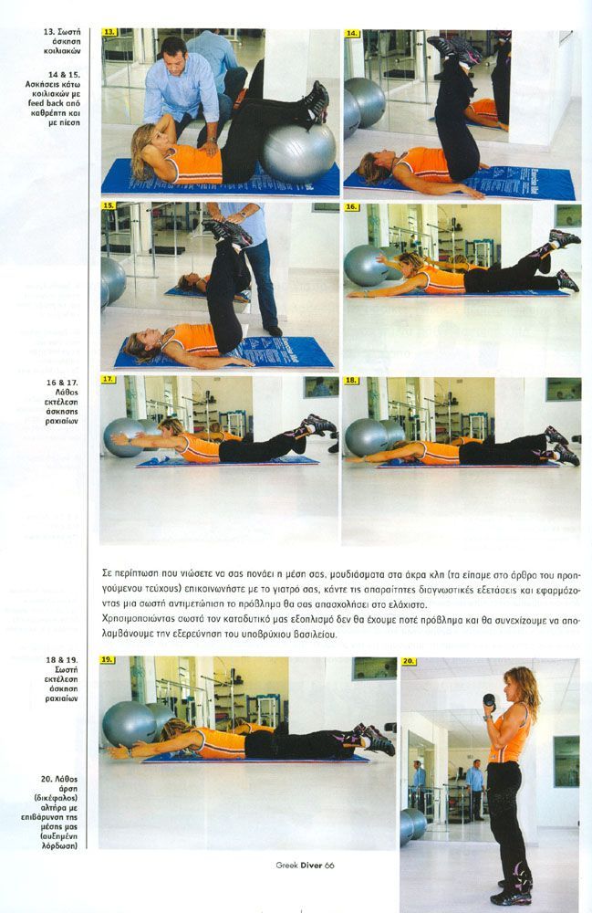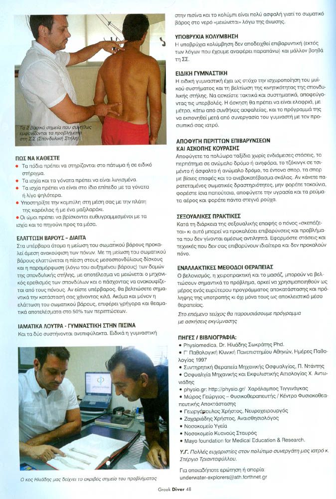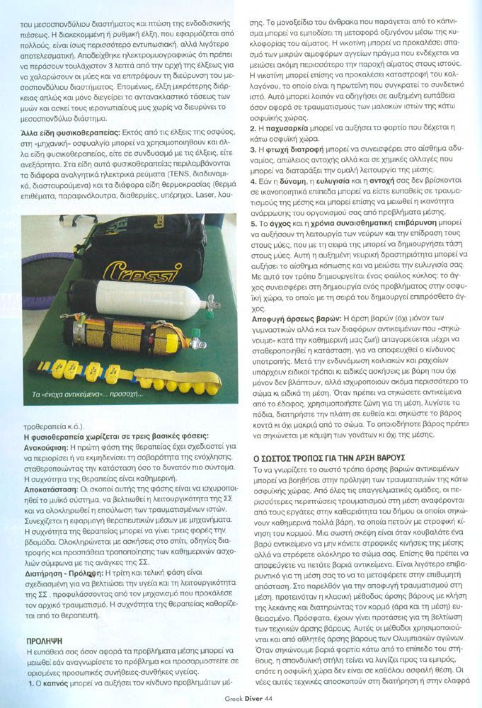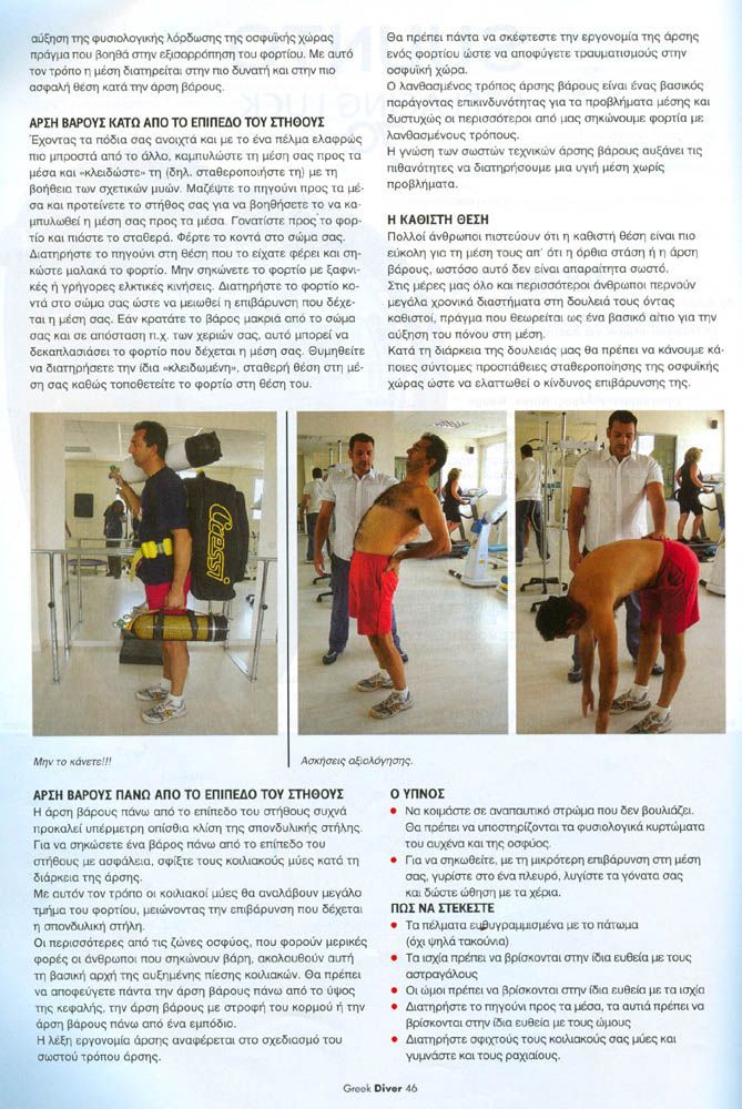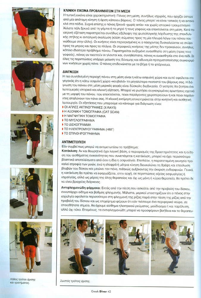 Τέτοια κλασσική περίπτωση είναι η Κήλη Μεσοσπονδύλιου Δίσκου από την οποία υποφέρουν πολλοί αυτοδύτες. Τα βάρη στη μέση, η φιάλη ή οι διπλές φιάλες, οι stage φιάλες, τα scooter και όλος ο υπόλοιπος εξοπλισμός μας αποτελούν έναν μοχλό δύναμης τον οποίο εάν δεν διαχειριστούμε σωστά μπορεί να μας προκαλέσει τραυματισμούς.